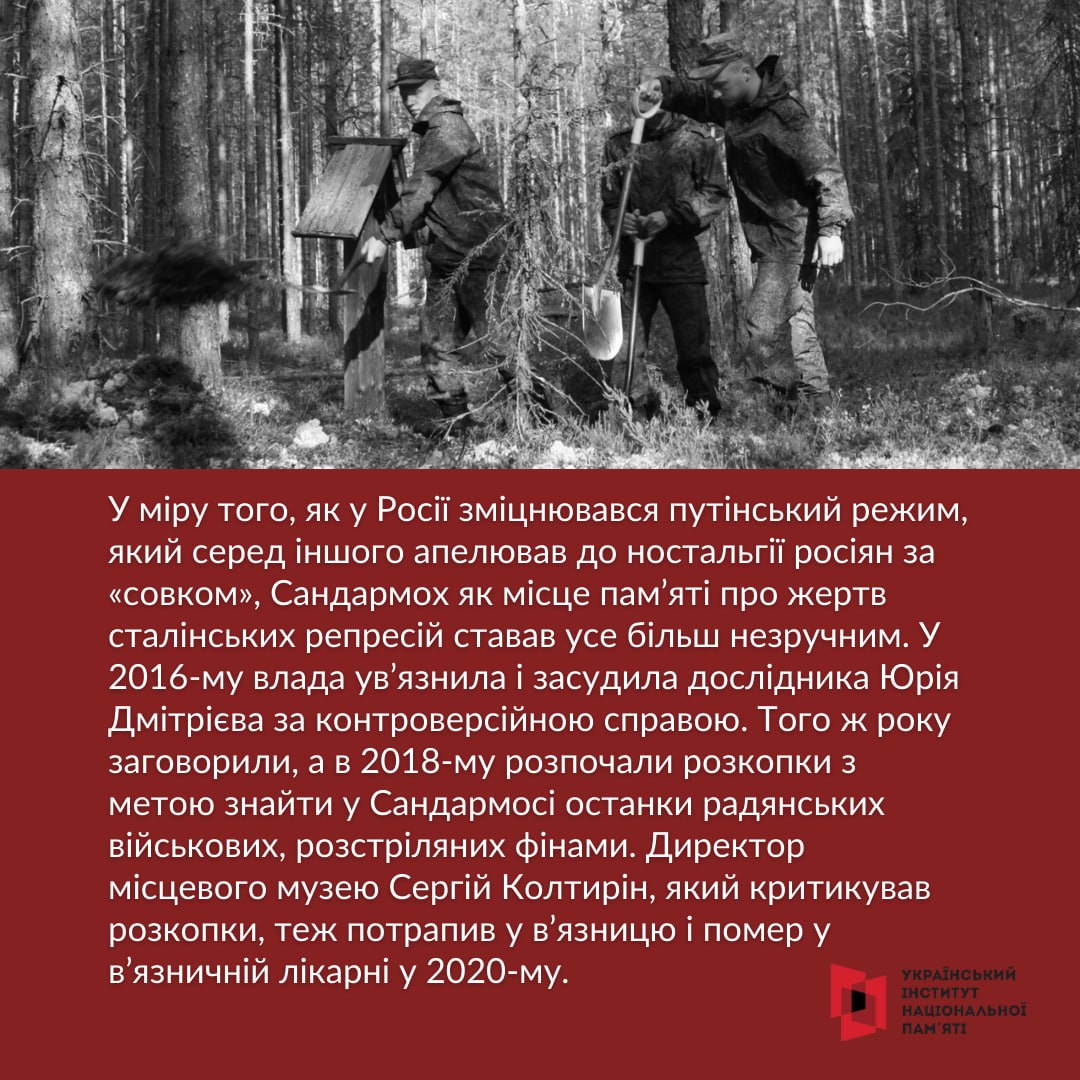 Сьогодні Сандармох асоціюється ще й зі спробами російської влади знову стерти памʼять про політичні репресії радянського часу, принаймні у своєму суспільстві.